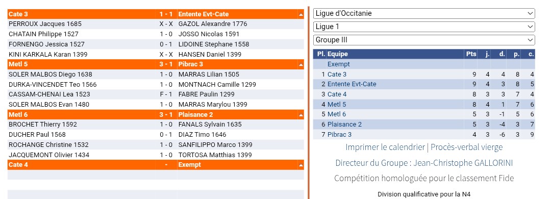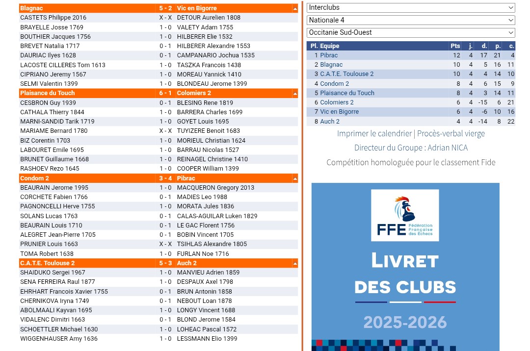 En ligue 1, jour de repos pour les leaders CATE4, mais l’équipe 3 recevait notre club ami, l’Echiquier Villeneuve Tolosane, à la Salle Nougaro, en parallèle du match N3.